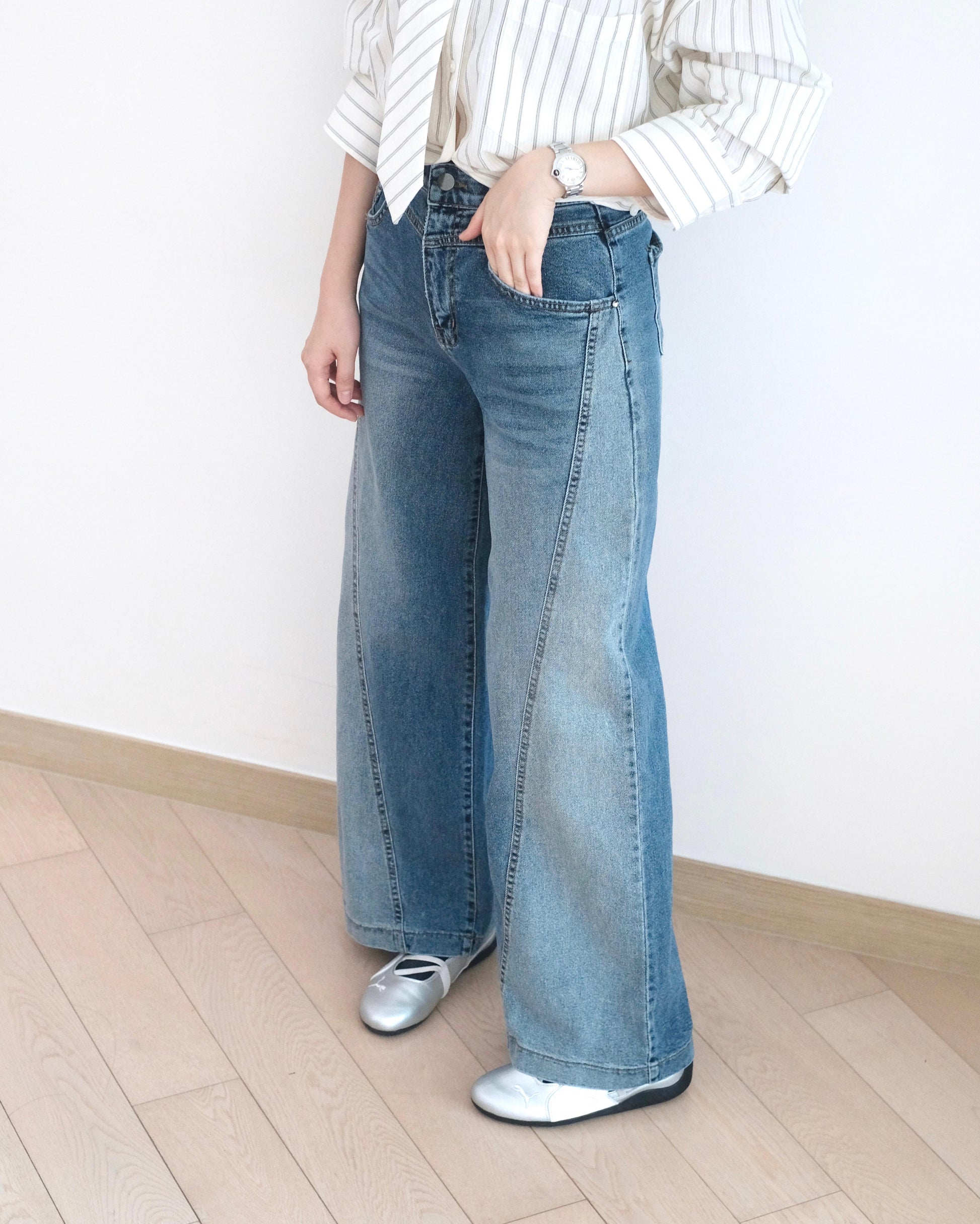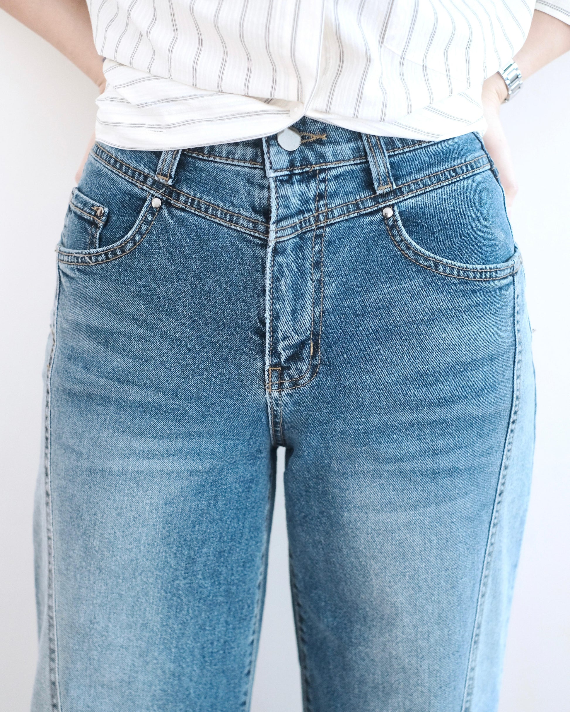 洗水設計,修飾腰圍沿至褲腳的拼接